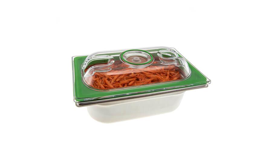 Zakaj vakuumirati? Ker boste prihranili čas in denar! Če ste mislili, da je uvajanje vakuumskega shranjevanja v vašo kuhinjo predrago, ste se zmotili. Potrebna je le manjša investicija v GN pokrove, ki bo spremenila obstoječe GN posode v vakuumske posode za shranjevanje živil.