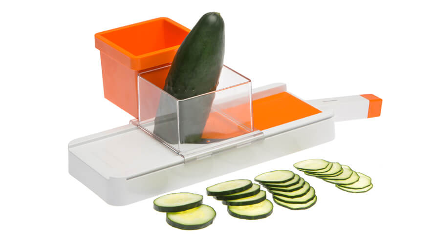 - prilagojena oblika rezalnika omogoča namestitev neposredno na posodo, v katero narežete živila in se tako izognete umazanemu pultu in koščkom živil, ki letijo naokrog.