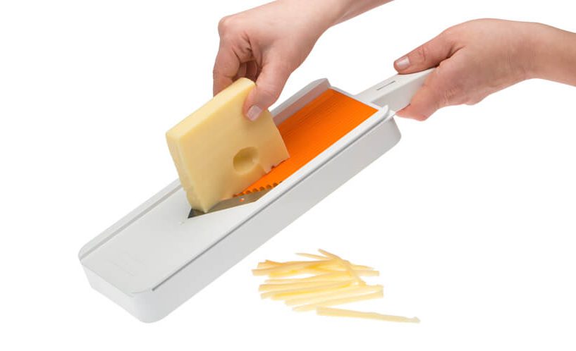 - prilagojena oblika rezalnika omogoča namestitev neposredno na posodo, v katero narežete živila in se tako izognete umazanemu pultu in koščkom živil, ki letijo naokrog.