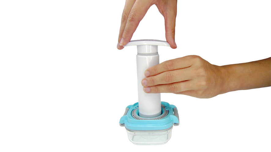 - Uporabite ročno vakuumsko črpalko za vakuumiranje vakuumske posode, v katero ste shranili sadje in zelenjavo, moko, kavo, polento, zelišča, gotove jedi ali druga živila, ki jim želite podaljšati obstojnost in svežino ter zaščititi njihove hranljive vrednosti in arome. Z vakuumiranjem tudi preprečite širjenje neprijetnih vonjav po hladilniku in kuhinji.